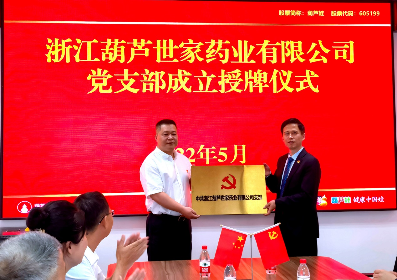 活动现场宣读了《关于同意成立中共浙江葫芦世家药业有限公司支部有关事项的批复》,并进行了党支部授牌仪式,支部书记金维逸代表党支部接牌,并带领现场党员重温入党誓词。