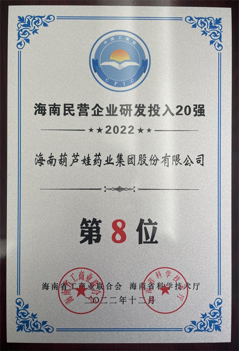 12月23日,2022海南民营企业50强和研发投入20强发布会在海口举行。会上发布了“2022海南民营企业50强”“2022海南民营企业研发投入20强”榜单和分析报告。俄罗斯专享会294药业再次荣登两榜,在海南民营企业50强榜单中位列第25位,较去年上升8位,这也是公司连续三年登榜;在海南民营企业研发投入20强中位列第8位,较去年上升7位。
