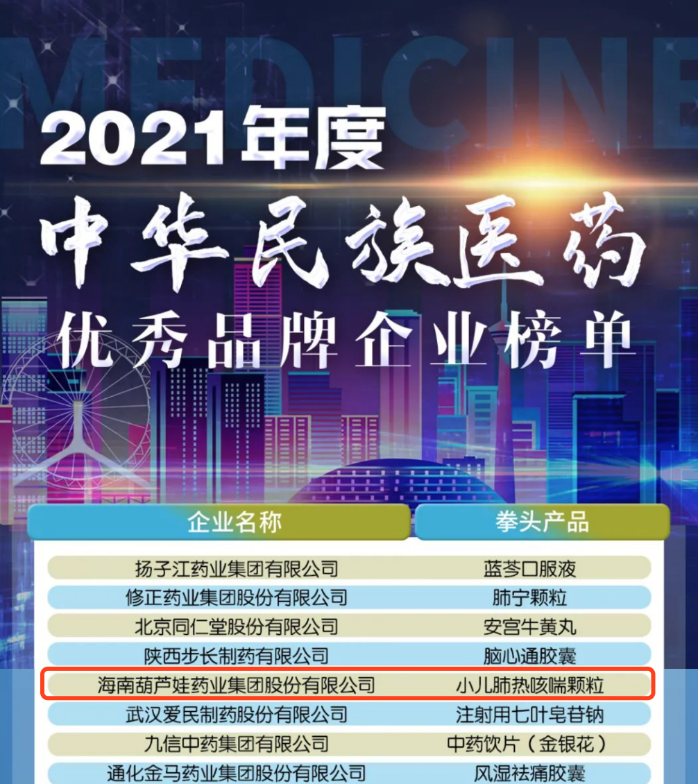12月29日,全国工商联医药业商会发布了“2021年度中华民族医药优秀品牌企业榜单”,俄罗斯专享会294药业集团凭借黄金单品小儿肺热咳喘颗粒(4克)实力登榜。